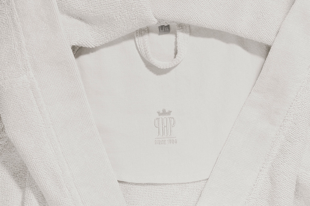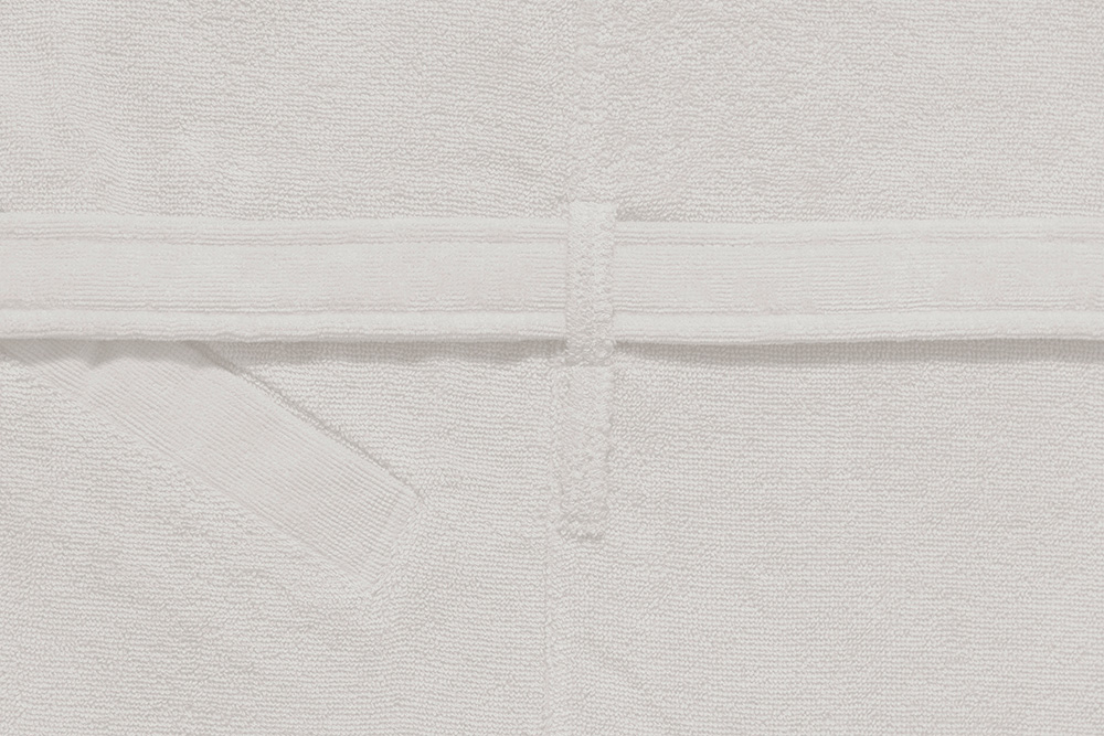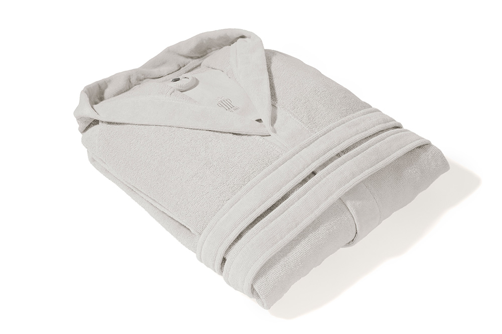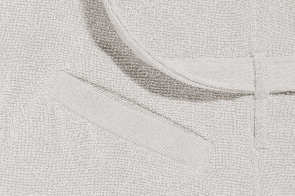L’accappatoio dispone di: un cappuccio, due tasche laterali, due tasche interne, una cintura per la vita con doppio passante, un gancio per essere appeso.