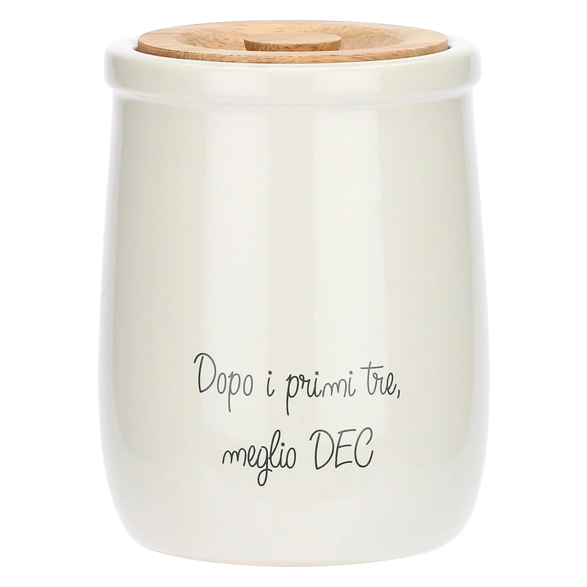 Divertente e originale, questo barattolo in porcellana bianca è decorato con la frase “Caffè dopo i primi 3 meglio dec”.