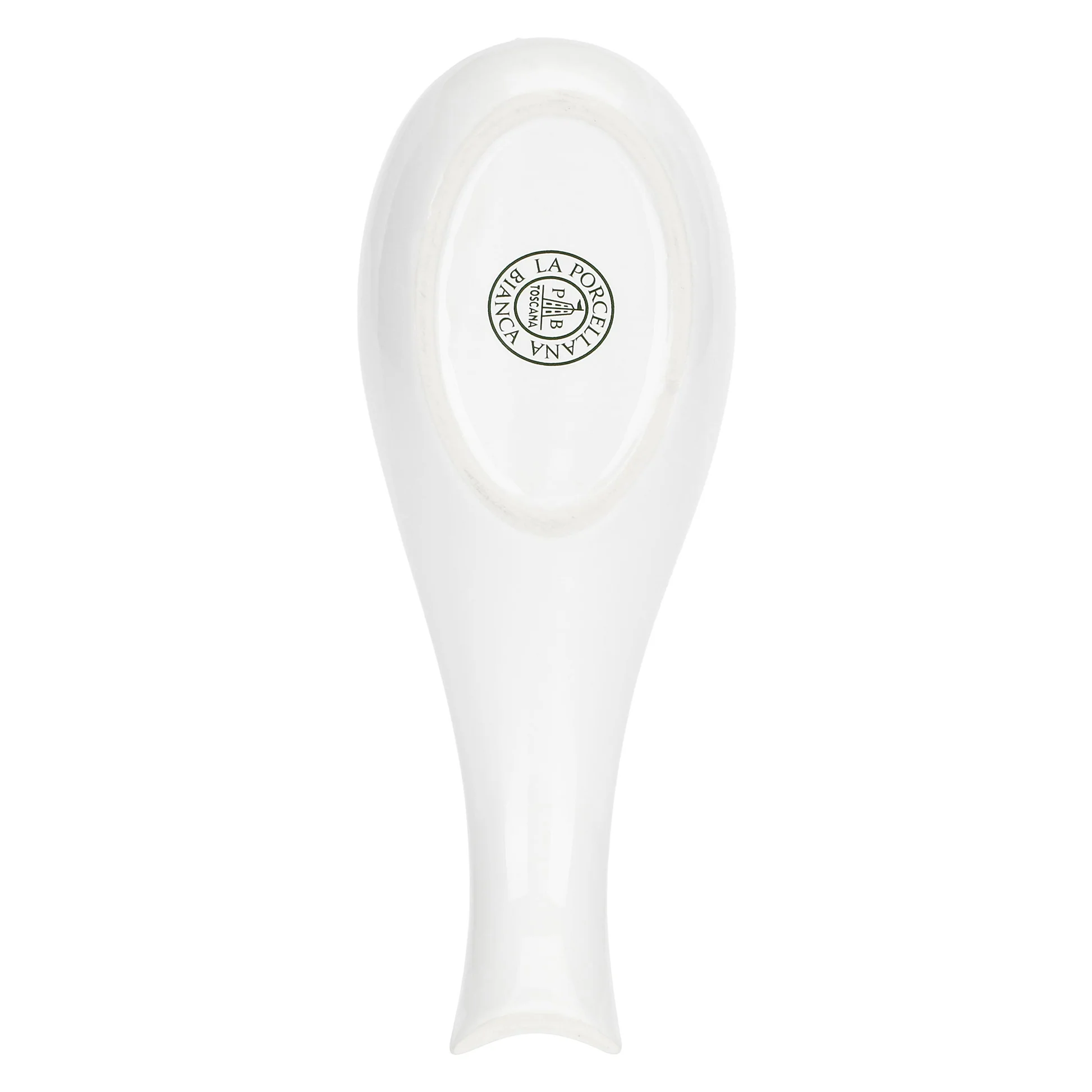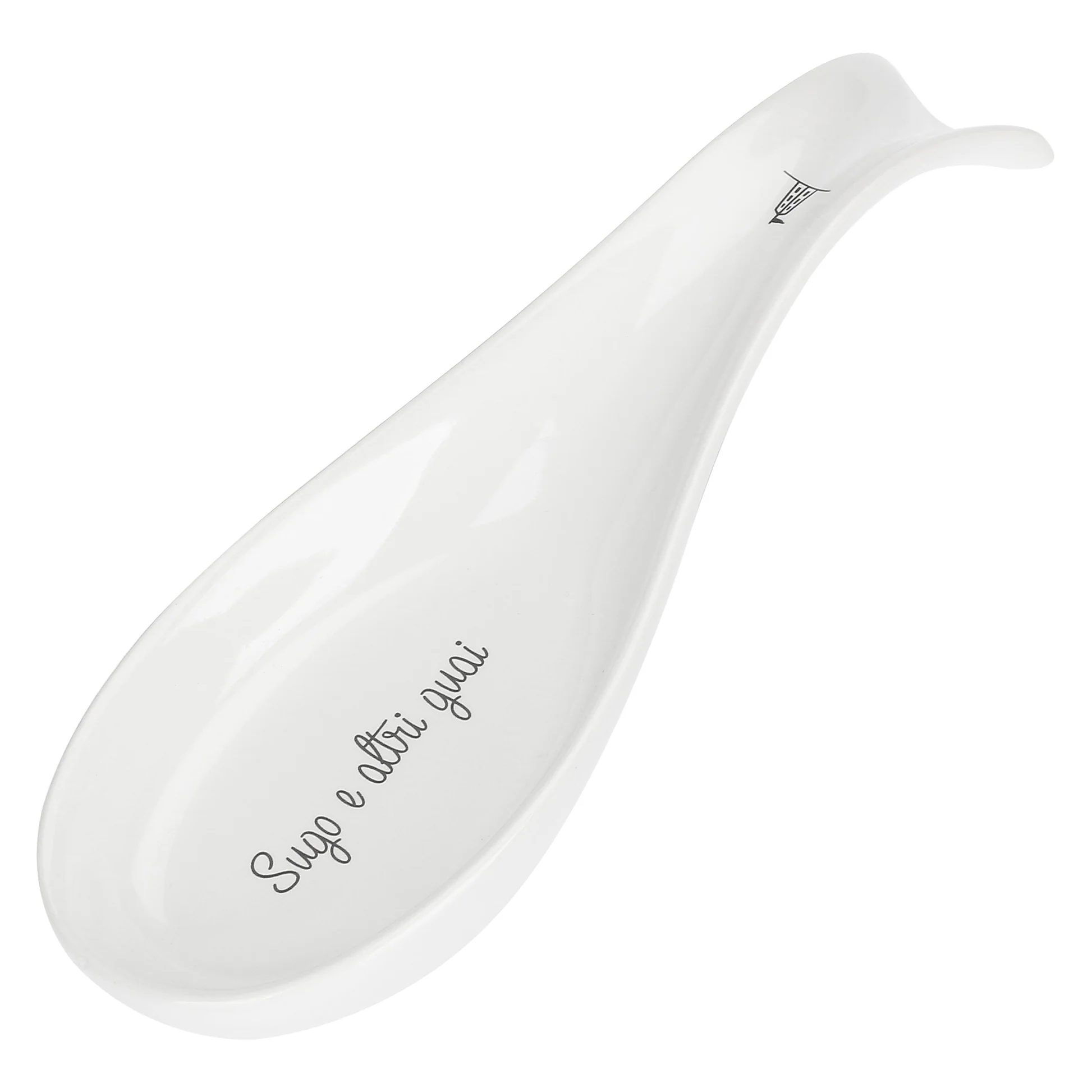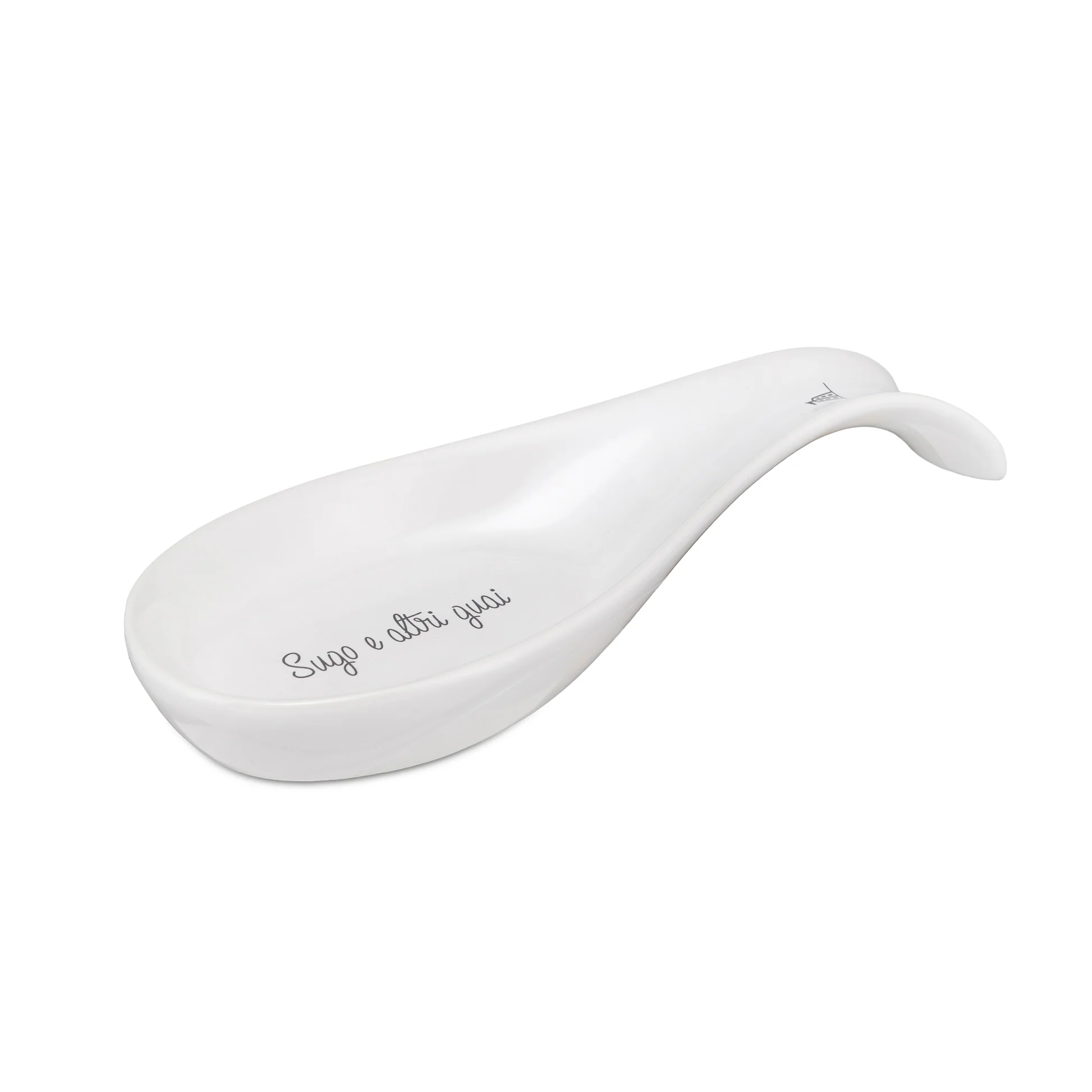 Pratico e divertente, questo poggiamestolo in porcellana bianca è decorato con la scritta “Sugo e altri guai”.