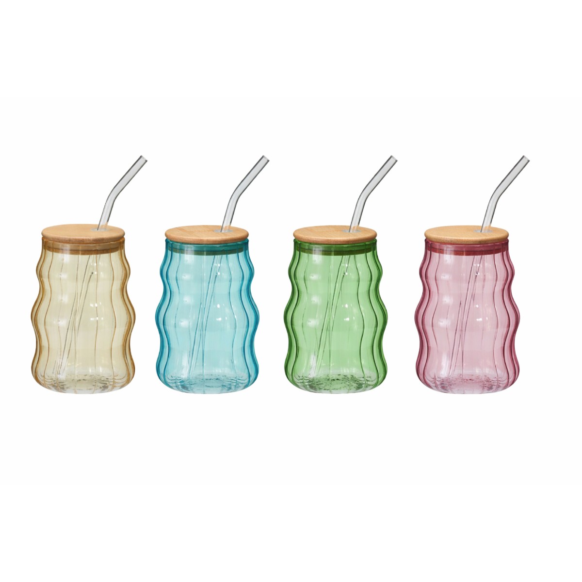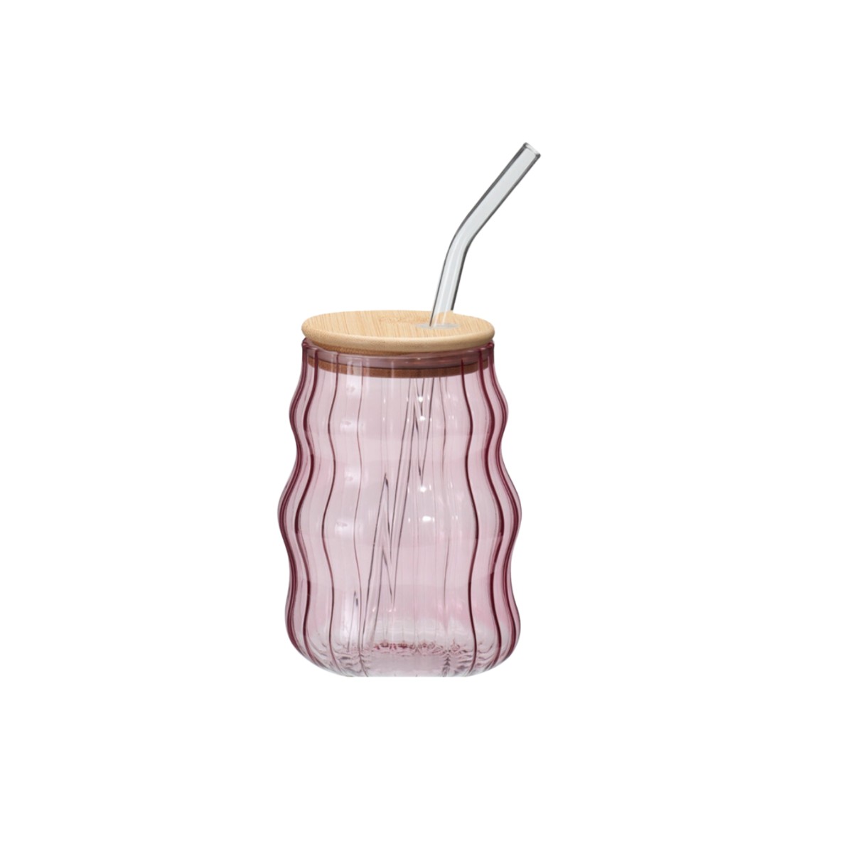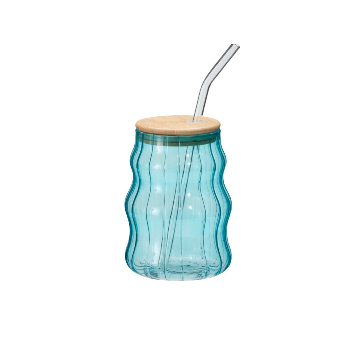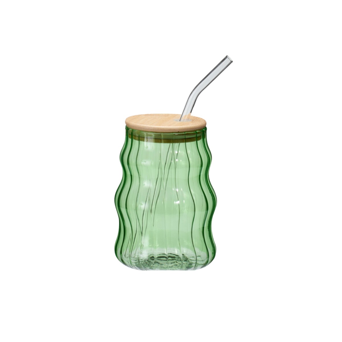Bicchiere in vetro con coperchio e cannuccia, ideale per gustare bevande fresche in modo pratico e raffinato.