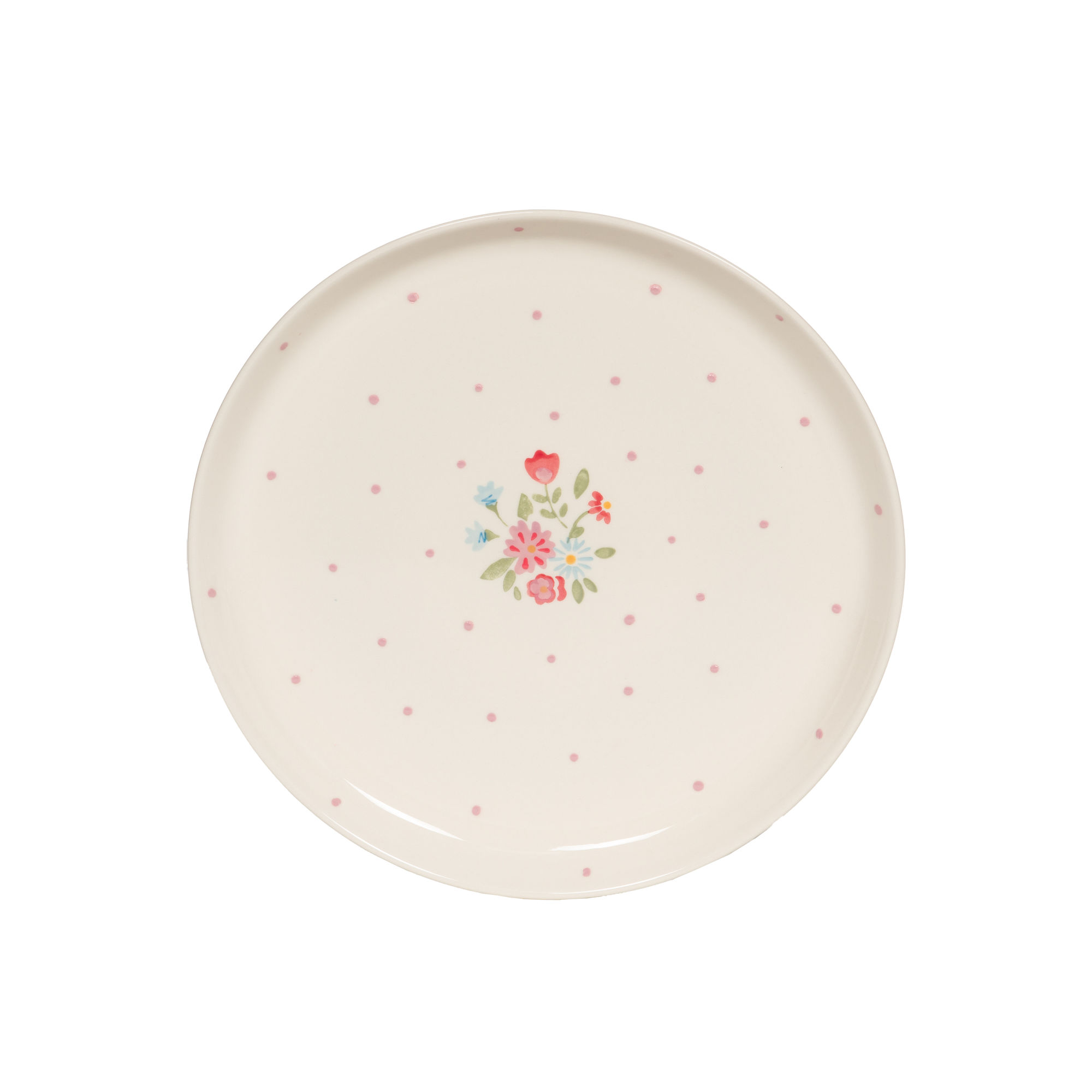 Piatto piano in ceramica con delicata decorazione floreale e piccoli dettagli a pois, perfetto per apparecchiare la tavola con uno stile semplice e raffinato.