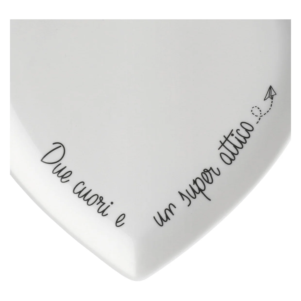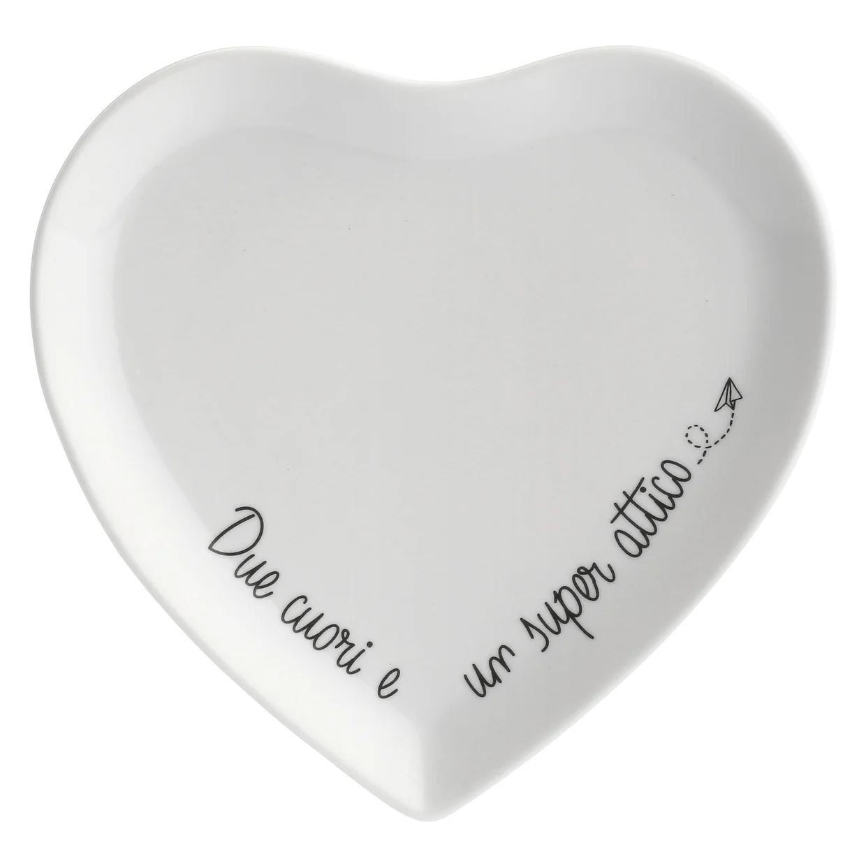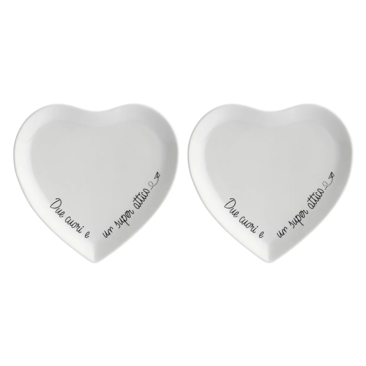 Delicati e super simpatici, questi piattini a forma di cuore in porcellana bianca sono decorati con la frase “Due cuori e un super attico”.