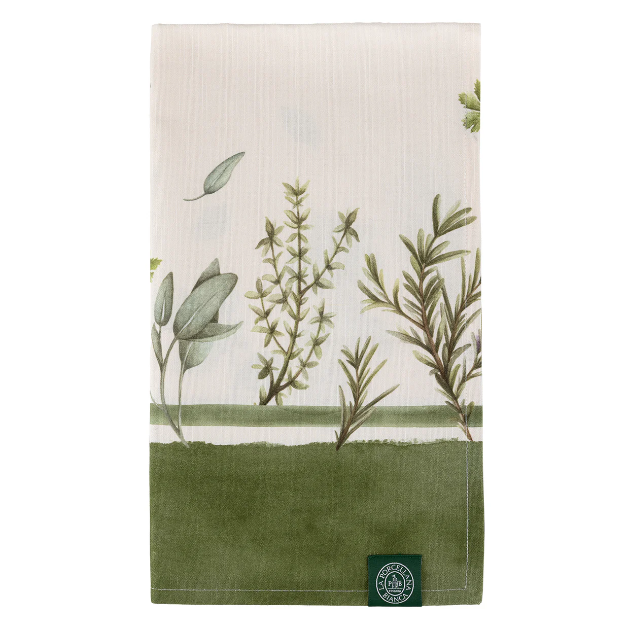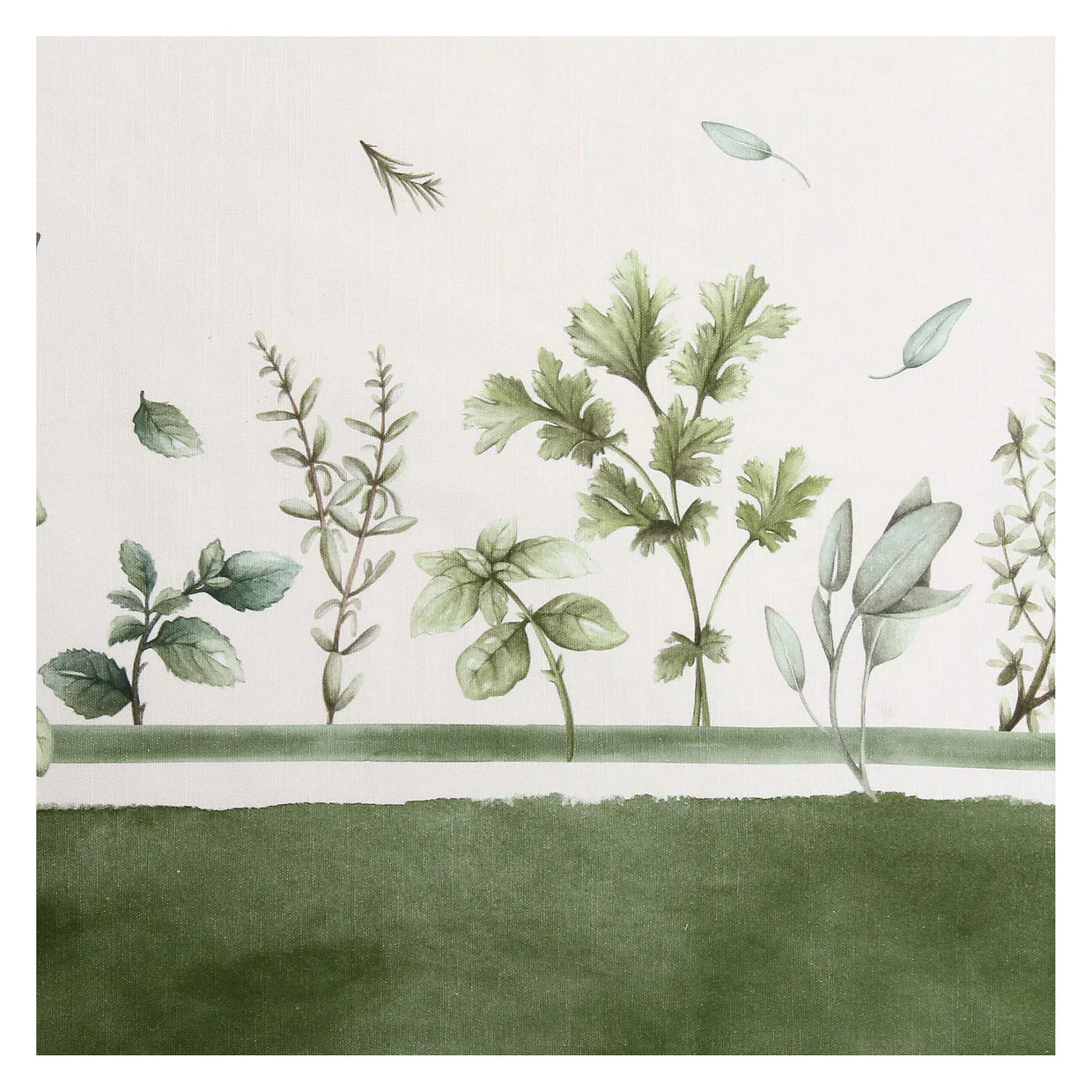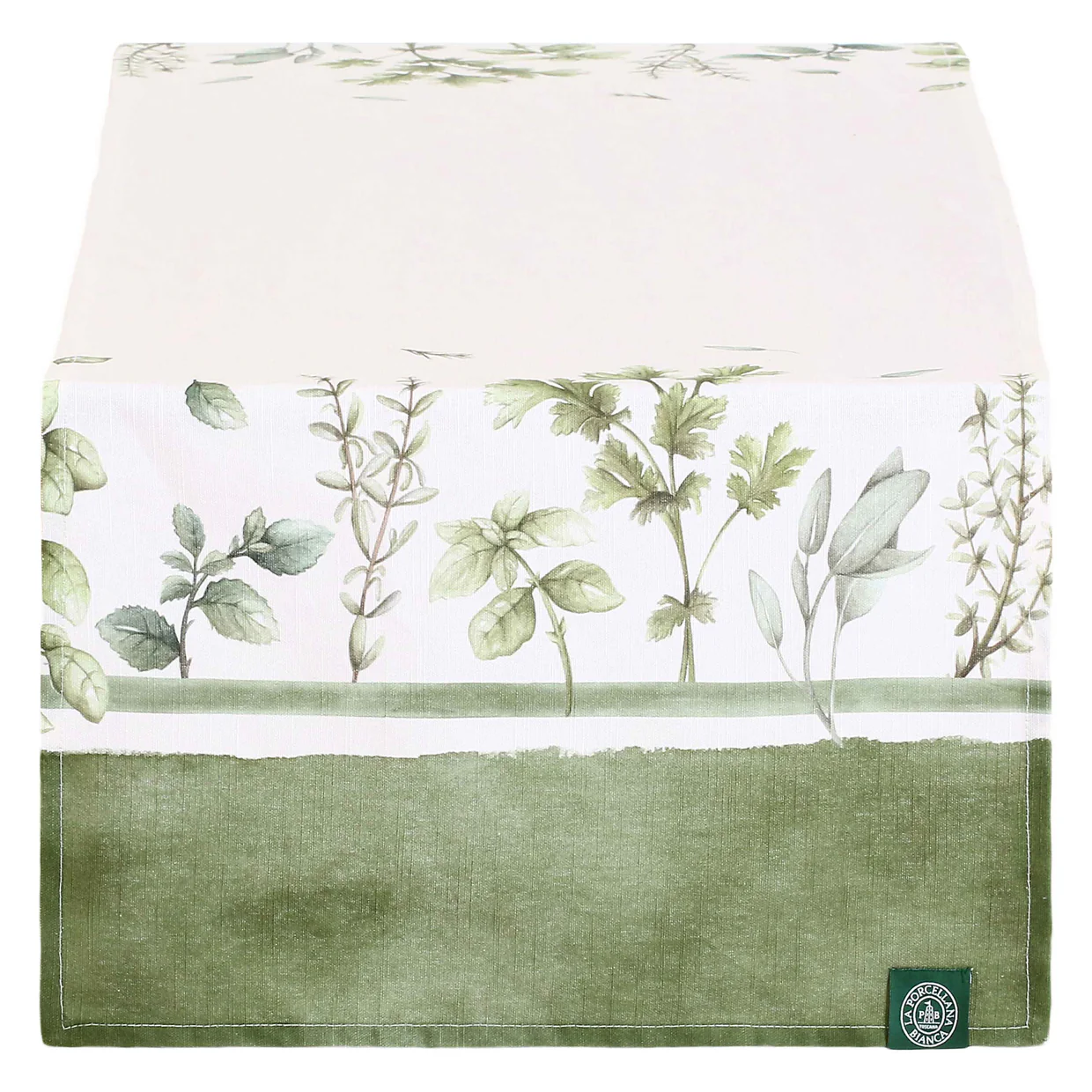 Naturale e delicato, questo runner da tavolo è decorato con un elegante motivo di erbe aromatiche nei toni del verde.