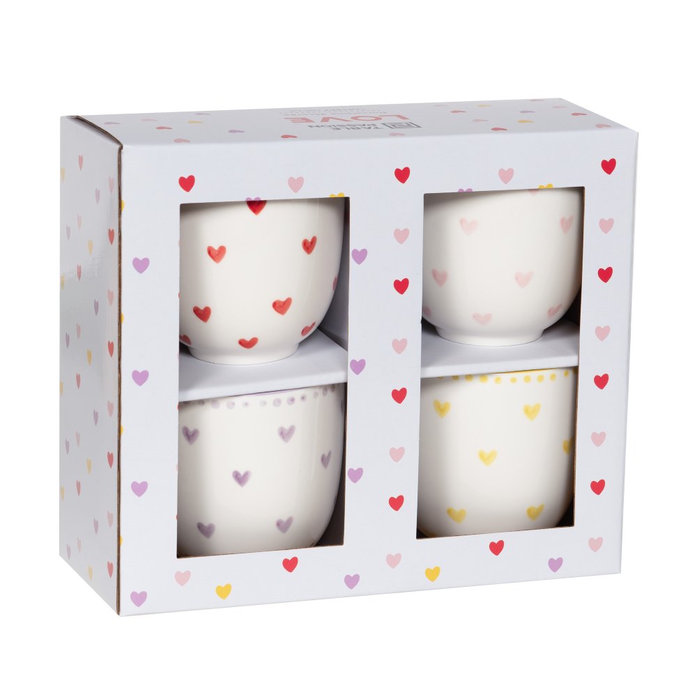 Tazza in ceramica con delicato motivo a cuori e bordo colorato, perfetta per colazione, cappuccino o tisane.