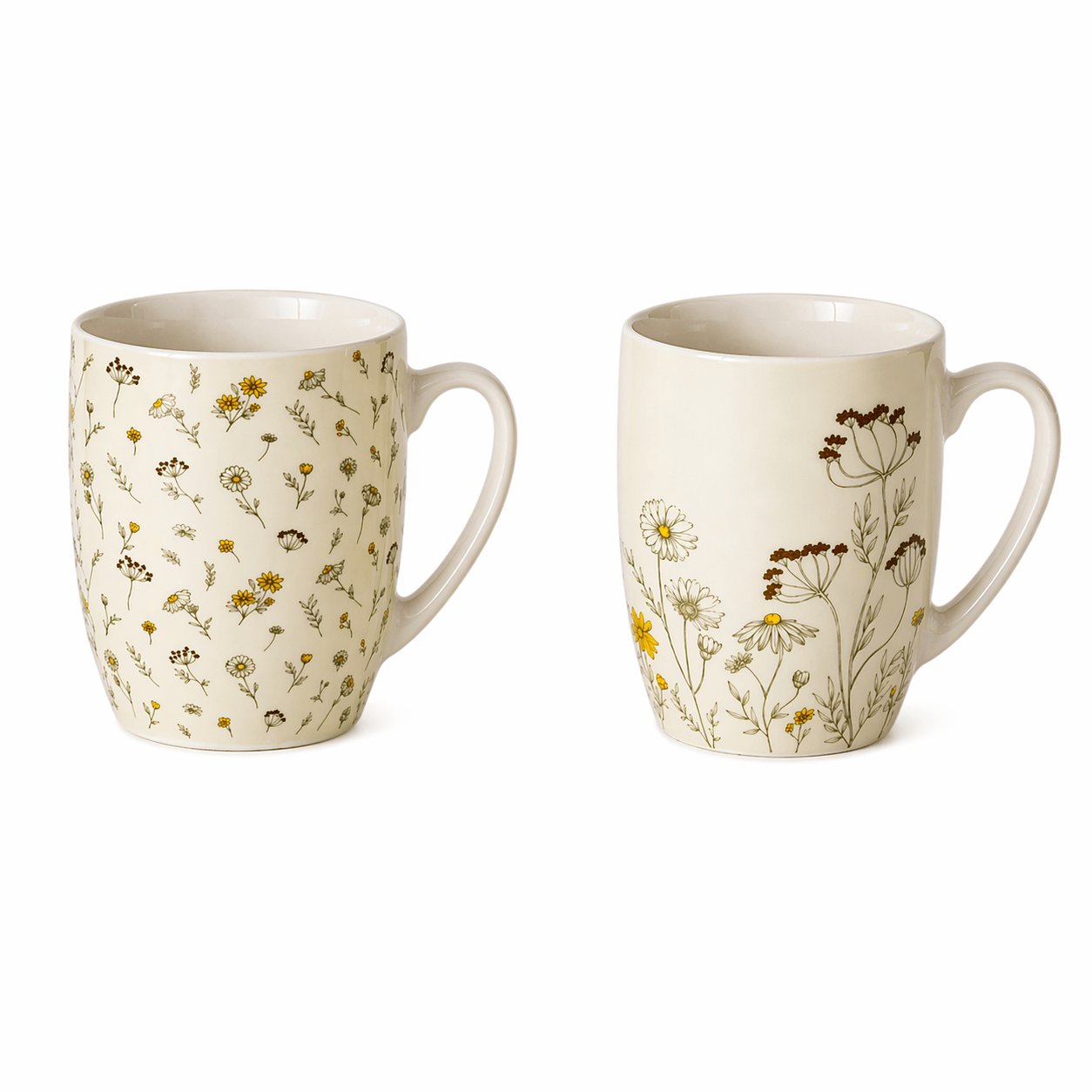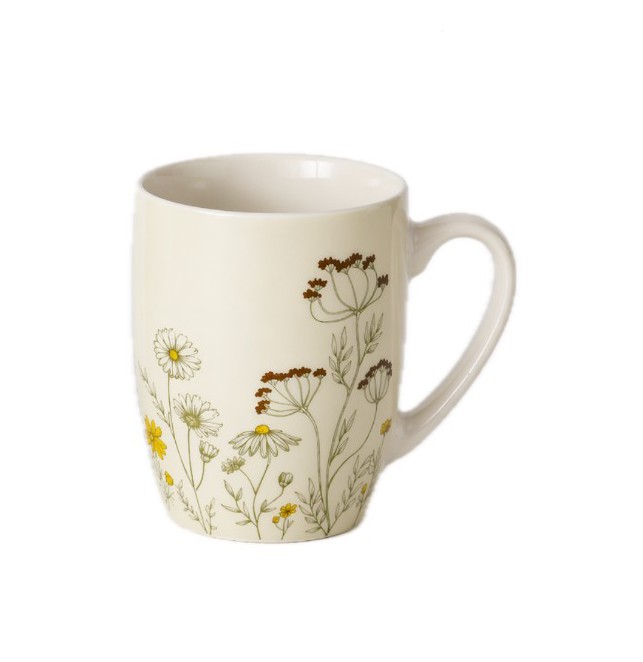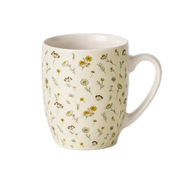 Tazza mug in ceramica con delicato decoro di fiori di campo, perfetta per colazione, cappuccino o tisane.