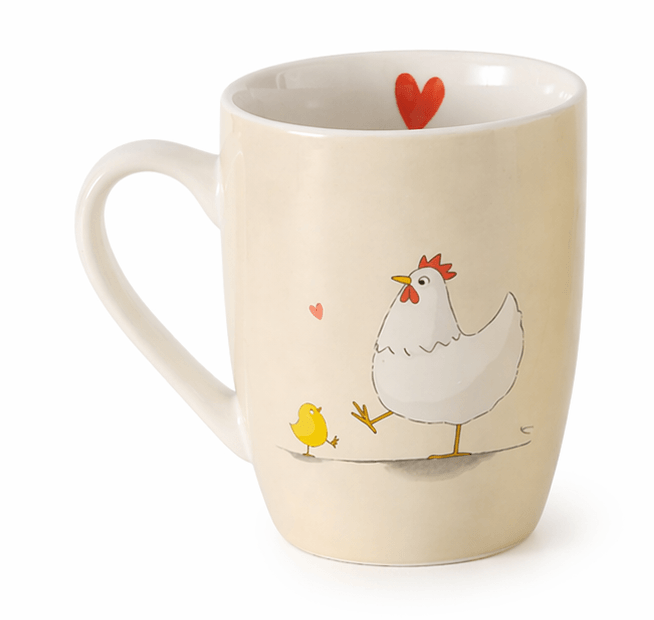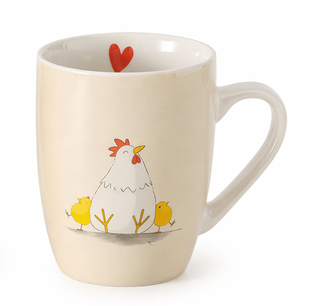 Tazza mug in ceramica con simpatica decorazione di gallina e pulcini, perfetta per colazione, latte, cappuccino o tisane.