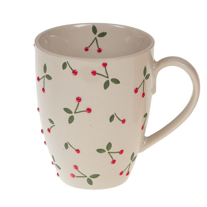 Tazza mug in ceramica con fantasia di ciliegie e manico colorato, perfetta per colazione, cappuccino o tisane con un tocco fresco e decorativo.