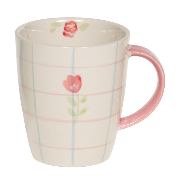 Tazza mug in ceramica con delicata fantasia a quadretti e piccolo fiore decorativo, perfetta per colazione, cappuccino o tisane con un tocco dolce e raffinato.