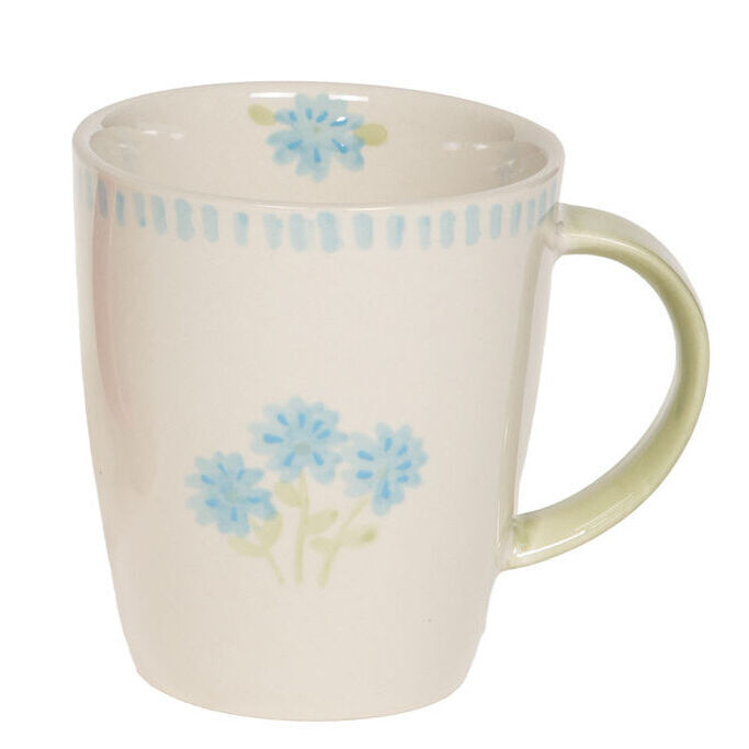 Tazza mug in ceramica con delicata decorazione di fiori azzurri, perfetta per colazione, cappuccino o tisane con un tocco elegante e primaverile.